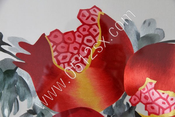 【苏绣绣品说明】该刺绣为苏绣隔断屏风,该刺绣由镇湖绣娘精心刺绣而成,绝非苏北绣和山东等其他外地绣。所用丝线均为4-6丝的苏绣专用丝线,比头发丝还细,此副石榴图的做工是极为精细,是由5个镇湖绣娘历时3月呕心之作,此副石榴图是由山东某单位定制,所以是由绣娘加班加点完工的,采用高档精细做工。是您家居装修、办公大厅的理想装修产品,本苏绣屏风最适合家庭玄关、隔断设计。