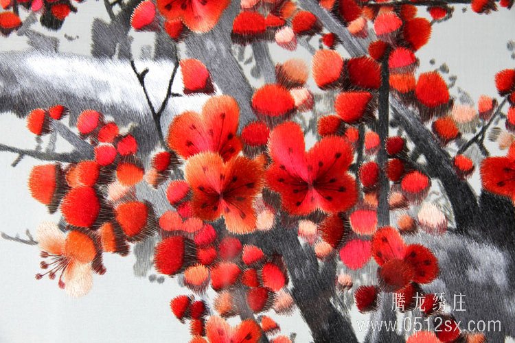 梅花的做工看整体图可能还不算明显,但是把镜头拉到最近,看梅花的立体效果,绣线的粗细就明显能看出刺绣的优劣了