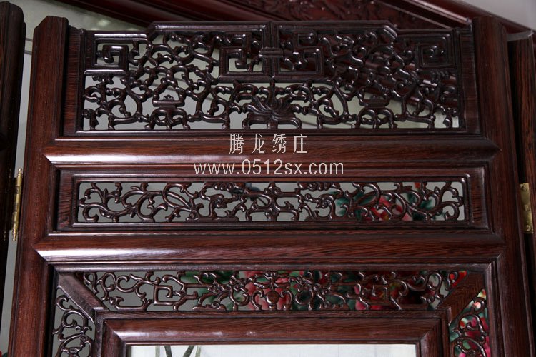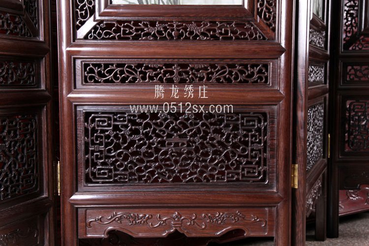 【苏绣木架说明】而该苏绣的木架全部由高级木匠用进口鸡翅木打磨而成,不含任何油漆,全部由木工打磨上蜡,环保豪华,衬托主人的品位,宽度可自由控制,是你房子装修的最佳选择。该木架的做工是非常精细的,每个雕刻处均由木工细心雕琢,可以从细节图中看到,并且木质纹理清晰可见,这是鸡翅木最明显的特征。