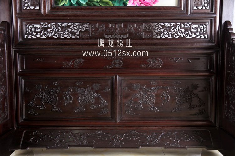 【苏绣木架介绍】而该苏绣的木架全部由高级木匠用正宗鸡翅木打造而成,不含任何油漆,环保无毒,用料实足,雕刻精美,极尽豪华,衬托主人的品位,是你房子装修的最佳选择。该木架的做工是非常精细的,可以从细节图中看到,并且木质纹理清晰可见,这是鸡翅木最明显的特征。